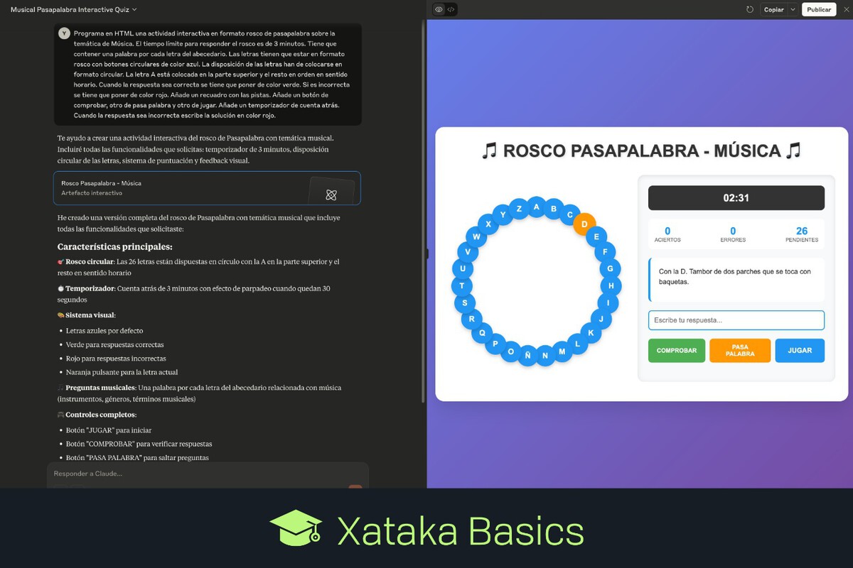 Un ejemplo de prompt para Pasapalabra en Claude: "Programa en HTML un rosco de Pasapalabra sobre Música. Tiempo límite: 3 minutos. Una palabra por letra. Botones circulares azules. Verde para correcto, rojo para incorrecto. Incluye pistas, botones 'comprobar', 'pasa palabra', 'jugar' y un temporizador."