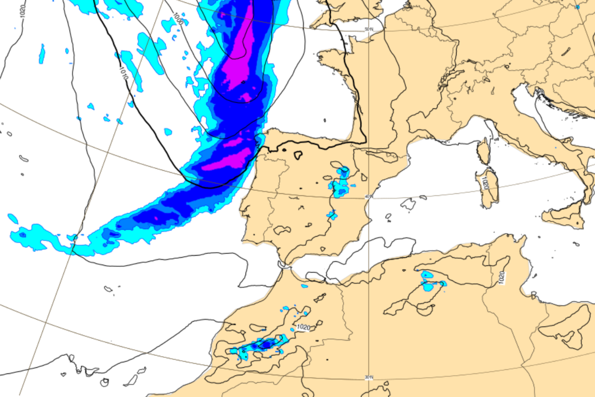 Las previsiones meteorológicas indican la llegada del río atmosférico a la costa oeste de la Península entre las últimas horas del sábado y el comienzo del domingo. Aunque la borrasca asociada se desplaza a mayor altitud, su frente provocará fuertes lluvias. La corriente en chorro, más intensa de lo normal, facilita el desplazamiento de este fenómeno a través del Océano Atlántico hasta España.